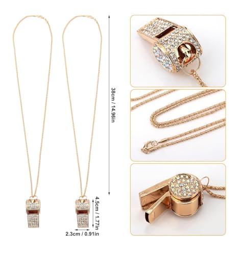 - تصميم أنيق وجذاب: تتميز هذه الصفارات بتصميم رائع مرصع بحجر الراين، مما يضفي لمسة من الأناقة والفخامة مع الحفاظ على وظيفتها العملية كاكسسوارات مفيدة. تسمح السلسلة الذهبية المرفقة بسهولة الحمل في أي وقت وفي أي مكان.