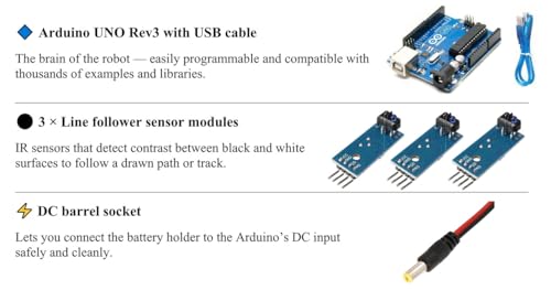 - قم ببناء سيارة تتبّع خطي حقيقية — تحتوي على 3 مستشعرات خطية بالأشعة تحت الحمراء تتيح تتبع المسار بدقة في مساراتك المصممة بنفسك.