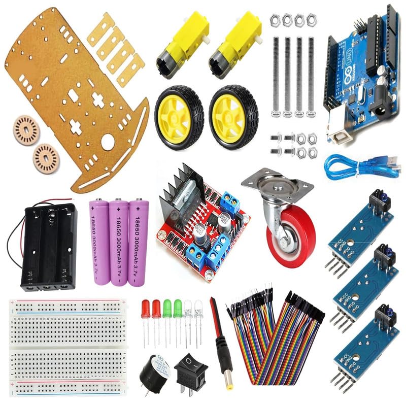 Generic - مجموعة سيارة روبوت ذكية ثنائية الدفع بتتبع خطي هيكل من ألياف كربون وخشب MDF، متوافقة مع أردوينو اونو، محركات، مستشعرات خطية، مصابيح ليد، جرس إنذار، محرك اتش بريدج، لوحة توصيل، حزمة بطارية للصنع بنفسك