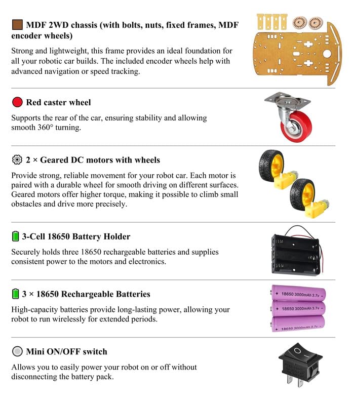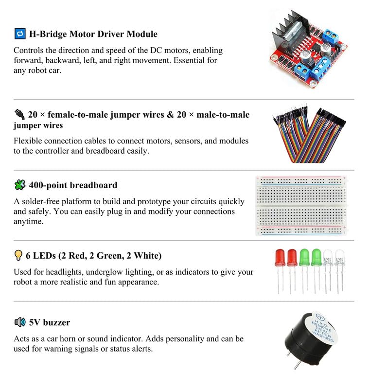 - إعداد إلكتروني متكامل — يتضمن لوحة اردوينو اونو ريف 3 ووحدة تحكم اتش بريدج ولوحة تجارب وأسلاك توصيل ونظام بطاريات.