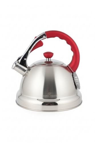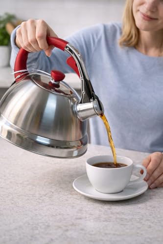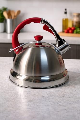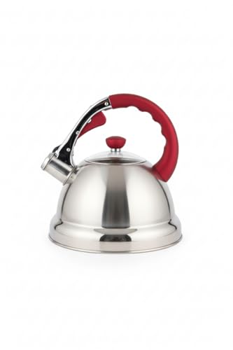 Generic - غلاية شاي من الستانلس ستيل بسعة 3.2 لتر بمقبض احمر - ابريق شاي بصفير عالي، غلاية تسخين سريعة للموقد الغاز والحث الكهربائي