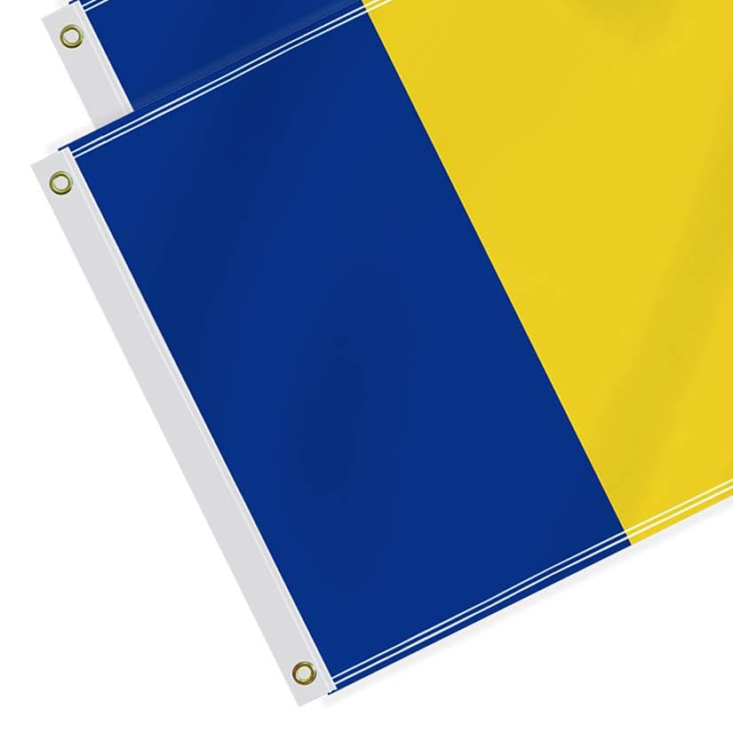 - مقاس 3 × 5 قدم، أبعاد كبيرة لافتة للنظر. حلقتان نحاسيتان تساعدان على ربطها بسارية العلم أو خطافات التثبيت.