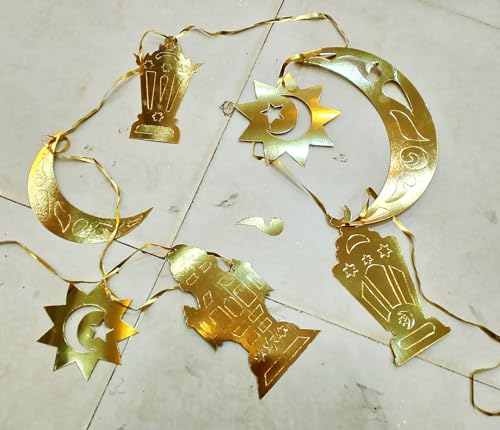 Generic - فرع زينة رمضان لون جولد فاخر بطول 3.5 متر – 7 دلايات أشكال فانوس وهلال ونجوم – زينة رمضانية أنيقة للبيت وركن