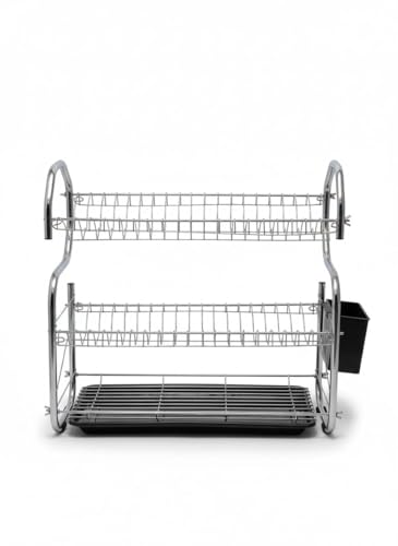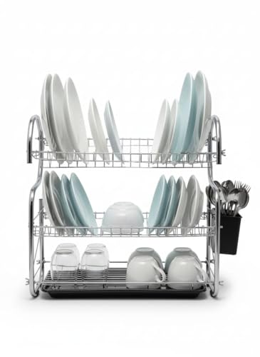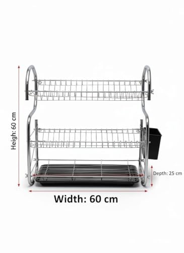 Generic - مطبقية مطبخ 3 ادوار - منظم اطباق ومجفف صحون معدن مطلي بالكروم 60 سم مع صينية تجميع مياه وحامل جانبي - رف اطباق منظم مطبخ من 3 طبقات