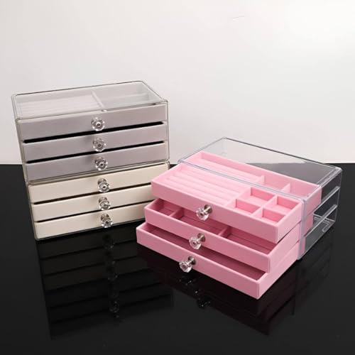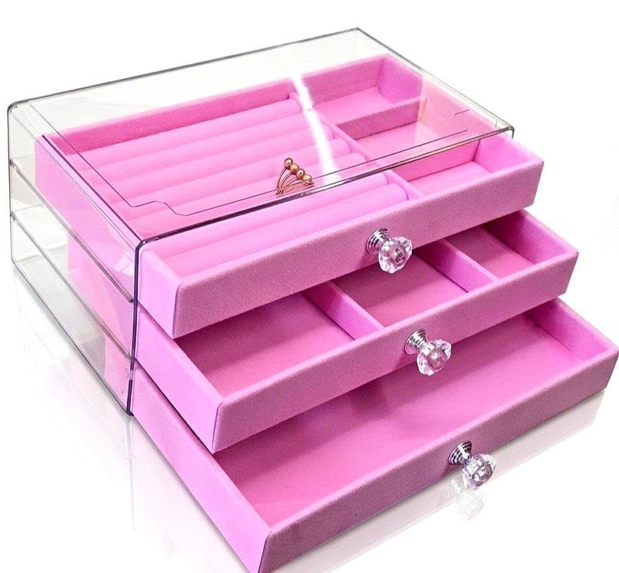 Generic - صندوق تنظيم المجوهرات بثلاث أدراج، شفاف مع بطانة مخملية، مع مقابض كريستال، متعدد الأقسام للإكسسوارات