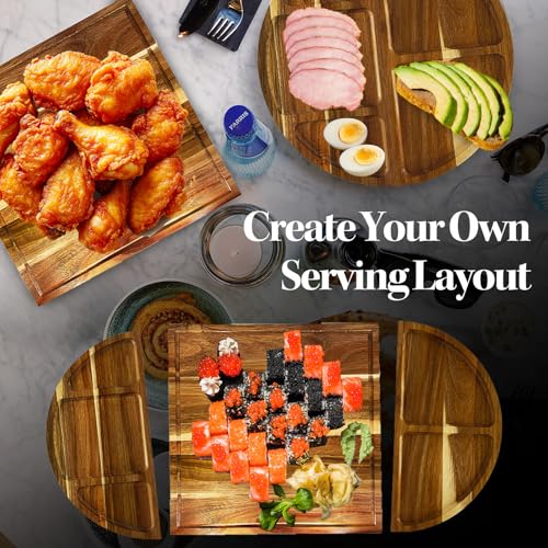 - أخدود وحافة مريحة للعصير: يتميز لوح التقطيع المربع مقاس 13 انش بأخدود عصير لالتقاط السوائل الزائدة، بينما يمنع اللوحان نصف الدائريان مع الحواف الطعام من الانسكاب. يحافظ هذا التصميم المدروس على منطقة تقديم الطعام نظيفة ومنظمة.