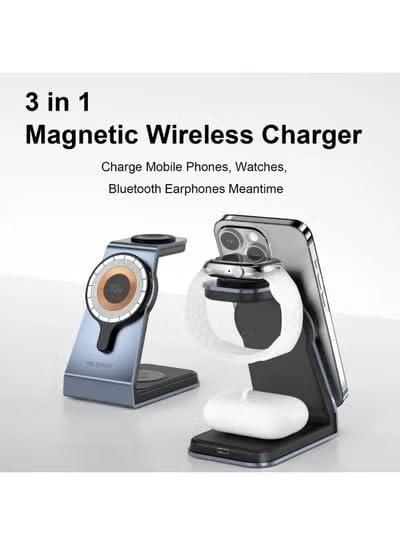 Generic - قاعدة شحن لاسلكية مغناطيسية 3 في 1، حامل شحن سريع 15W للآيفون والساعات والإيربودز، قاعدة من خليط الألومنيوم متوافقة مع ماج سيف، حل شحن الكل في واحد، مناسب للجرابات، وضع أفقي أو عمودي