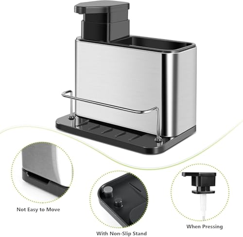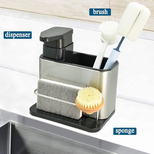 Generic - موزع صابون 3 في 1 مع منظم حوض عملي من ستانلس ستيل مقاوم للصدأ ومساحة تخزين للإسفنج والفرش تصميم موفر للمساحة مناسب للمطبخ والحمام