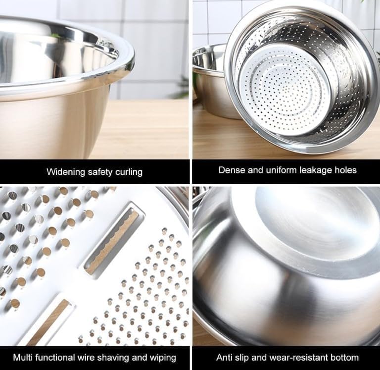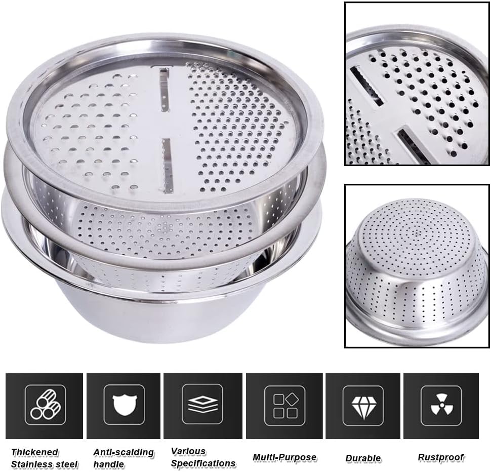 Generic - طقم عجان ومبشرة ومصفاة ستانلس ستيل 3 في 1 متعدد الاستخدام حجم كبير لتقطيع الخضروات وتحضير الطعام وتصفيه المكرونة بسهولة وسرعة في المطبخ المنزلي