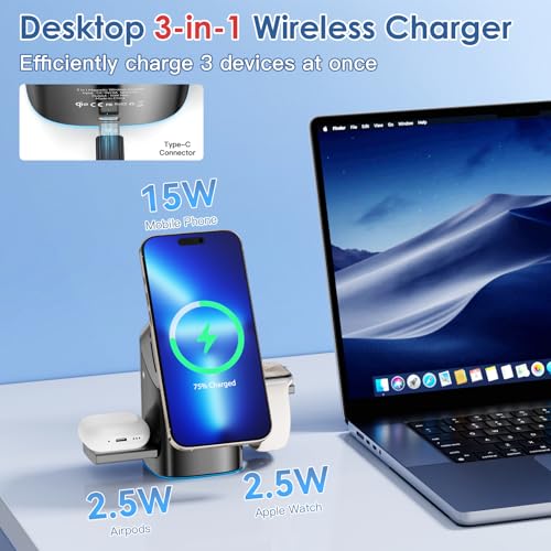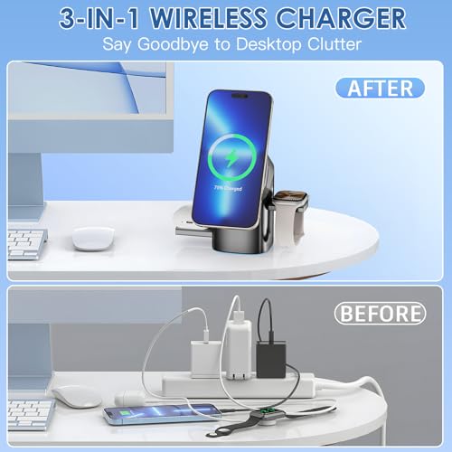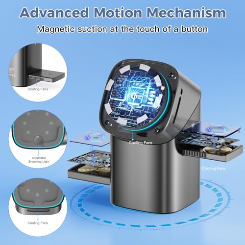PKBD - قاعدة شحن لاسلكية 3 في 1، حامل شاحن سريع امن 15 وات مع تصميم قابل للدوران 180 درجة وقابل للسحب لآيفون 16/15/14/ايربودز برو/ساعة آبل، مع أضواء ومروحة تبريد (يتضمن محول 30 وات)