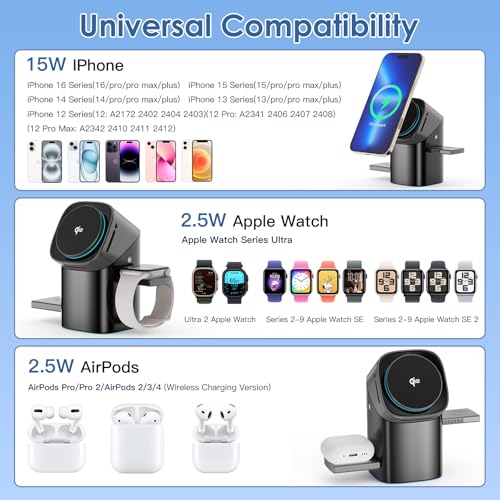- 🌍 توافق عالمي - يدعم الشاحن اللاسلكي سلسلة آيفون 16/15/14/13/12 برو/برو ماكس/بلس، ايربودز 2/3/4/برو، ساعة آبل الترا 2 إلى SE، بالإضافة إلى الموبايلات المحمولة والساعات وسماعات البلوتوث الأخرى التي تدعم Qi2. (غير مخصص للإصدار غير اللاسلكي)