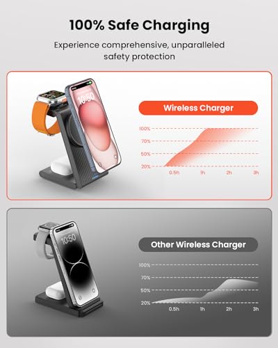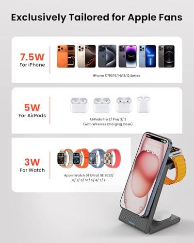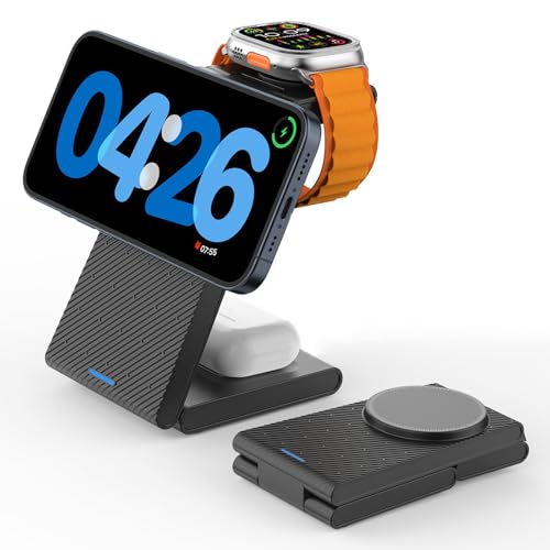GEEKERA - قاعدة شحن لاسلكية 3 في 1، حامل شاحن مغناطيسي قابل للطي لأجهزة متعددة، شاحن لاسلكي لايفون 16/15/14/13/12، ساعة ابل 9/8/7/6/SE/5/4/3/2، ايربودز 4/3/2/برو