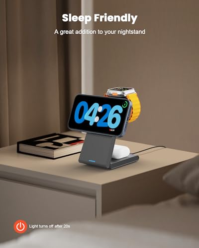 - قابلة للطي وجاهزة للسفر: بسمك 2.9 سم بعد الطي ووزن 0.7 باوند، فإن قاعدة الشحن اللاسلكية القابلة للطي هذه هي نفس حجم موبايلك تقريبًا، ولا تشغل أي مساحة على شنطة الظهر. لا مزيد من القلق بشأن حمل شواحن متعددة لأجهزتك. سواء كنت في عطلة أو رحلة عمل، فإن هذا الشاحن اللاسلكي 3 في 1 هو رفيقك الموثوق به في السفر!