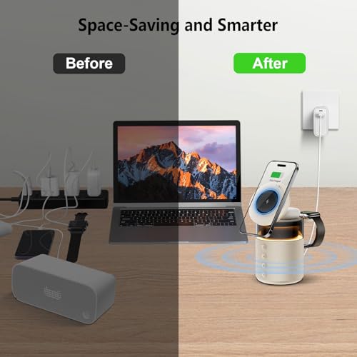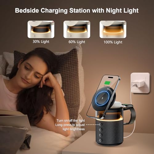 BLKE - قاعدة شحن لاسلكية 3 في 1، شاحن لاسلكي مغناطيسي لايفون 16 15 14 13 12 برو ماكس ايربودز ساعة ابل، حامل ذو تقنية شحن سريع 33 واط، قاعدة شحن بجانب السرير، ضوء، مكبر صوت بلوتوث للرجال