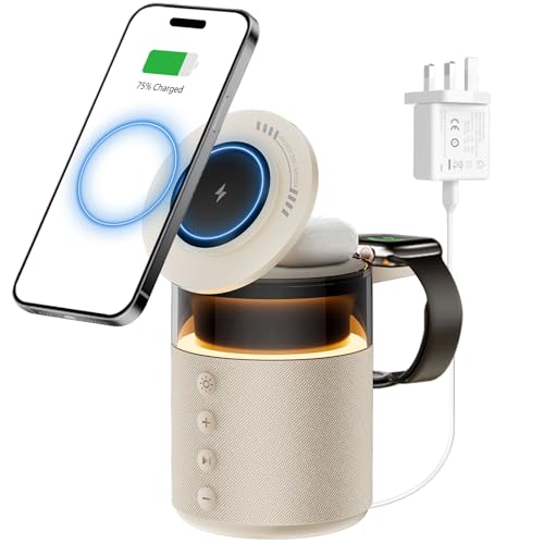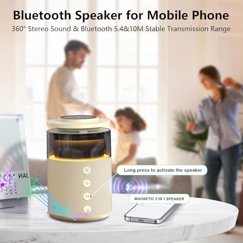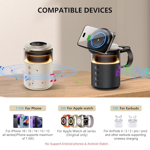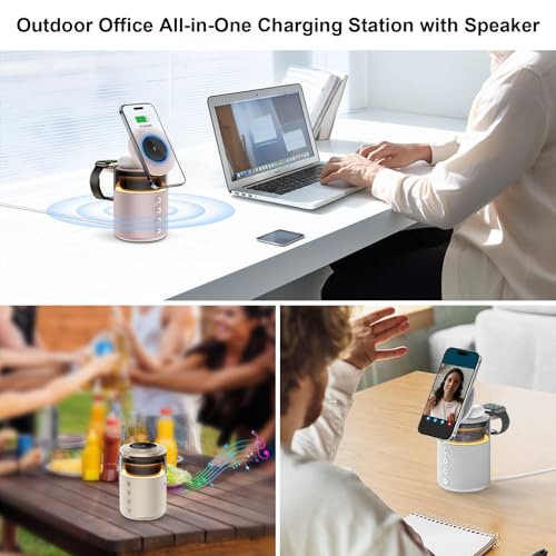 - 【مكبر صوت بلوتوث لاسلكي للايفون/الجوال】شاحن ايفون هذا مع مكبر صوت، بالإضافة إلى حامل شاحن عملي للهاتف والساعة، يتميز بمشغلات متقدمة للحصول على صوت واضح وصوت جهوري غني ونغمات متوازنة. مثالي للموسيقى والمدونات الصوتية والمكالمات بدون استخدام اليدين؛ اتصال بلوتوث 5.4 سلس للحصول على صوت مستقر وعالي الجودة. ملاحظة: عملية اتصال البلوتوث: اضغط لفترة طويلة على زر التشغيل (التشغيل) - جاهز للاتصال - تنشيط البلوتوث - ابحث عن "مكبر صوت مغناطيسي 5 في 1"