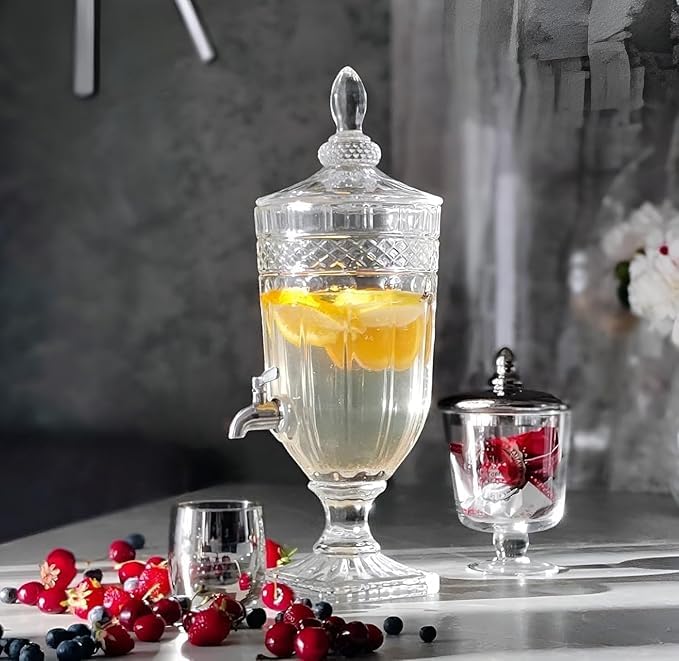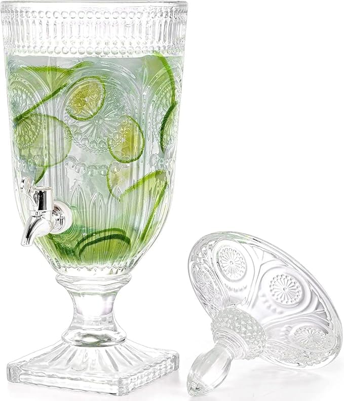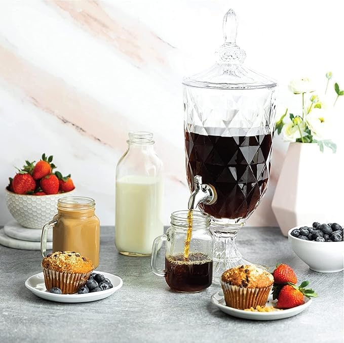 - مناسب تمامًا للإهداء خلال المناسبات المنزلية والتجمعات الاحتفالية والمناسبات الخاصة، يضيف موزع المشروبات هذا الأناقة إلى أي محطة مرطبات. مزيج من وضوح الزجاج والوصول إلى الصنبور والسعة الكبيرة يجعله اختيارًا مدروسًا لشخص يستمتع بتقديم المشروبات بأناقة.