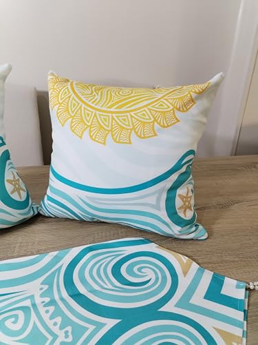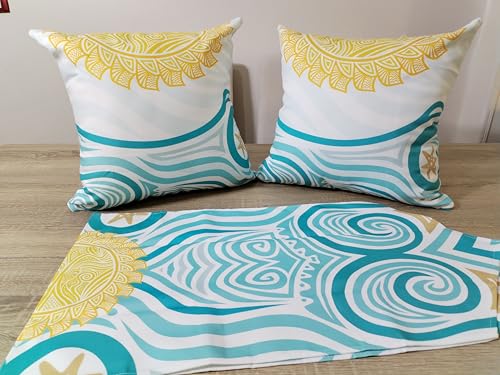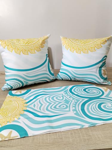 Generic - طقم 3 قطع كفر كوشنز ورانر مزين بنقوش الأمواج والشمس، أبيض وتركواز وأصفر الوان ثابته