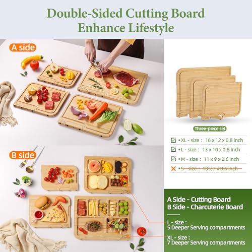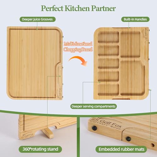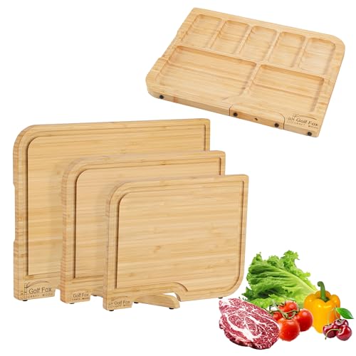 GolfFox - مجموعة الواح تقطيع من الخيزران مكونة من 3 قطع، لوح تقطيع خشبي للمطبخ مع حامل مبتكر واخاديد للعصير ومقبض، مزدوج الجوانب للتقطيع ولوح تشاركوتيري، هدية مطبخ للطهاة المنزلية، للحوم والفواكه