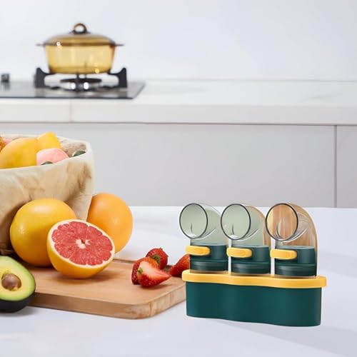 Dollar for Import - مجموعة زجاجات توابل بموزع كمي، 3 قطع مع قاعدة تخزين، إغلاق محكم، تصميم شفاف، أخضر وأصفر، للملح والفلفل والسكر والتوابل من دولار للاستيراد للادوات المنزليه