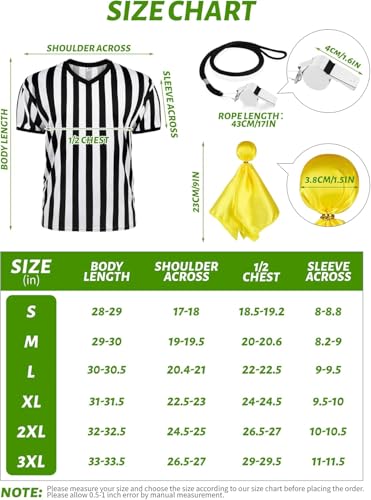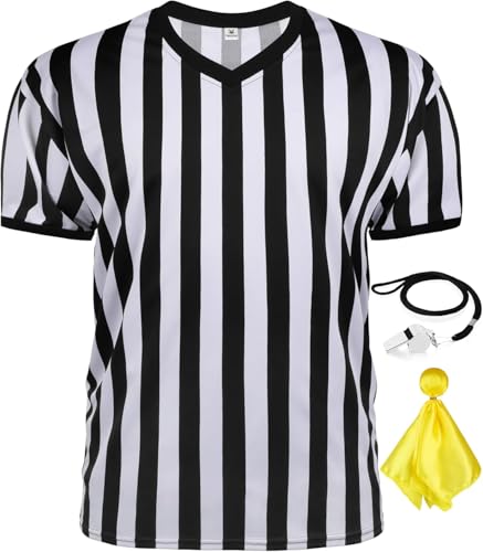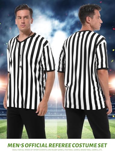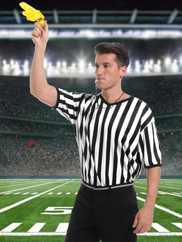 - طقم قميص الحكم: ستحصل على قميص حكم مخطط باللونين الأسود والأبيض وعلم الجزاء وصفارة من الستانلس ستيل، مما يوفر مجموعة كاملة للحكام الرياضيين.
