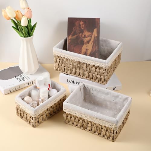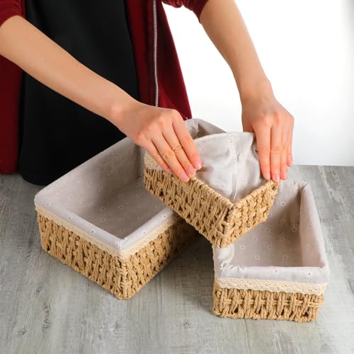 Ubamdom - سلة تخزين من 3 قطع مع بطانة، سلة خوص مزخرفة لطاولة القهوة، صينية مستطيلة، منظم سطح الحمام، منظم أدراج المطبخ المستطيل للتخزين (3 مقاسات)