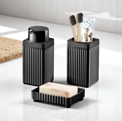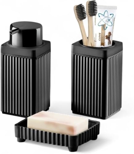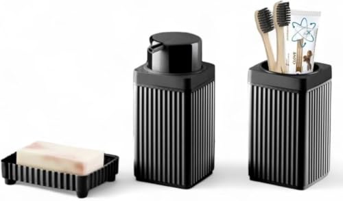 - مجموعة كاملة من 3 قطع: تتضمن المجموعة موزع صابون سائل عالي الجودة مصمم للحفاظ على الصابون جافًا ونظيفًا، وحامل فرشاة أسنان عملي يحمل العديد من فرش الأسنان ومعجون الأسنان - كل ما تحتاجه في مجموعة واحدة.