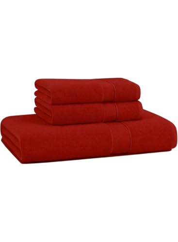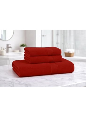generic - طقم مناشف حمام من القطن المصري بحواف من ورق الجاكار - منشفة يد كبيرة 100 × 50 سم و2 منشفة وجه 30 × 30 سم - عالية الامتصاص (احمر، منشفة يد + 2 منشفة وجه) من 3 قطع