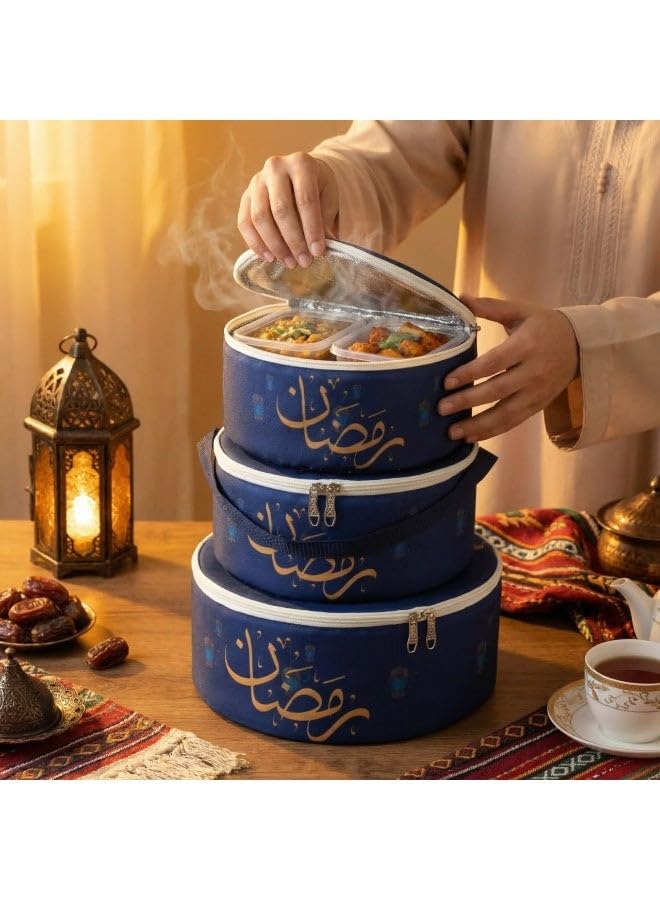 Generic - طقم حامل طعام حراري معزول من 3 قطع - تصميم رمضان انيق باللونين الازرق والذهبي - متعدد المقاسات.