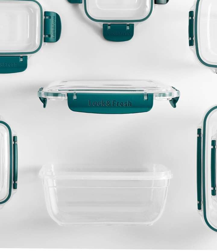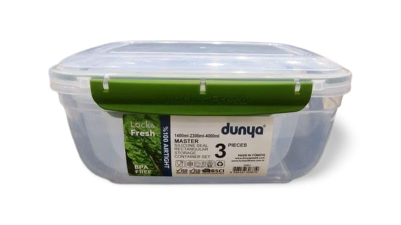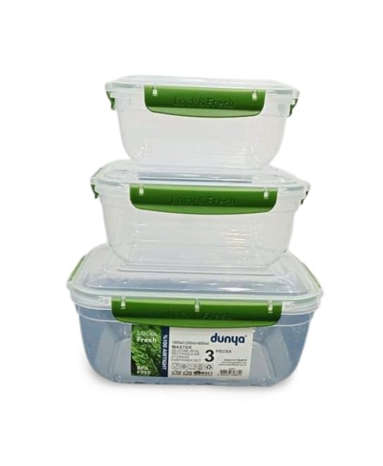 - علبة حفظ الطعام مستطيلة الشكل مصنوعة في تركيا من بلاستيك خال من البيسفينول أ مع غطاء محكم الإغلاق، لون شفاف وأخضر، 3 قطع.