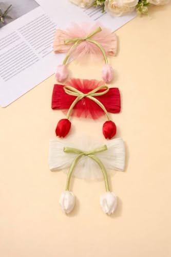 • تفاصيل زخرفية مميزة: تتميز كل عصابة بطبقات من التول الشفاف وزهور توليب ثلاثية الأبعاد مع فيونكات ملونة لمظهر أنيق ومتناسق