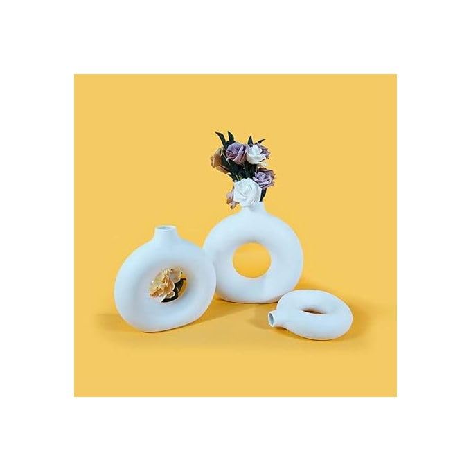 - تصميم دونتس العصري: طقم فازات سيراميك أنيق بشكل دائري مميز يضفي لمسة فنية راقية على أي مكان