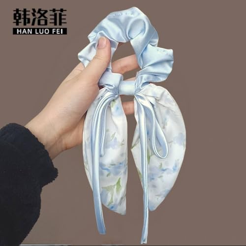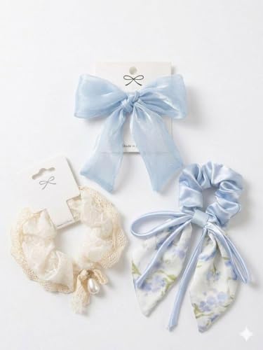 Generic - ربطات شعر فاخرة للبنات والنساء، 3 قطع، أشكال متنوعة بفيونكة وسكرانشي، لون أزرق ولبني، مضادة لتكسر الشعر