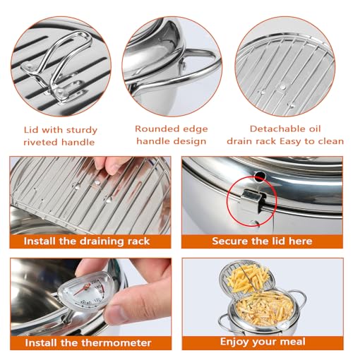 - [ فولاذ مقاوم للصدأ 304 آمن غذائيًا] حلة القلي العميقة هذه مصنوعة من الفولاذ المقاوم للصدأ 304 الآمن غذائيًا، وهو مقاوم للصدأ ويوزع الحرارة بالتساوي، مما يسمح للطعام بالطهي بالتساوي والحفاظ على نكهته الطبيعية.