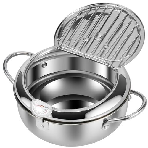 Fizocosisto - حلة مقلاة عميقة من 3 أحجام، وعاء تمبورا بنمط ياباني مع سلة مصفاة ومقياس حرارة، وعاء قلي عميق من الفولاذ المقاوم للصدأ مع مقبض، وعاء زيت للقلي العميق لقلي السمك والروبيان والدجاج