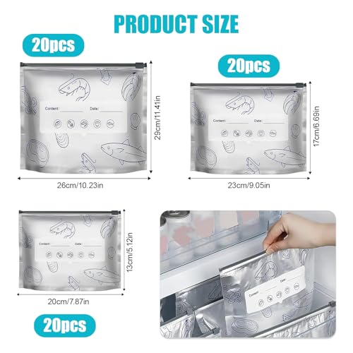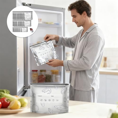 Nocecfi - اكياس فويل بسحاب قابلة للغلق بـ3 احجام، 60 قطعة من اكياس تخزين رقائق الالومنيوم قابلة لاعادة الاستخدام، اكياس رقائق معدنية قائمة مع ملصق وقفل بسحاب للمطبخ لتخزين الخضروات والفواكه واللحوم والطعام