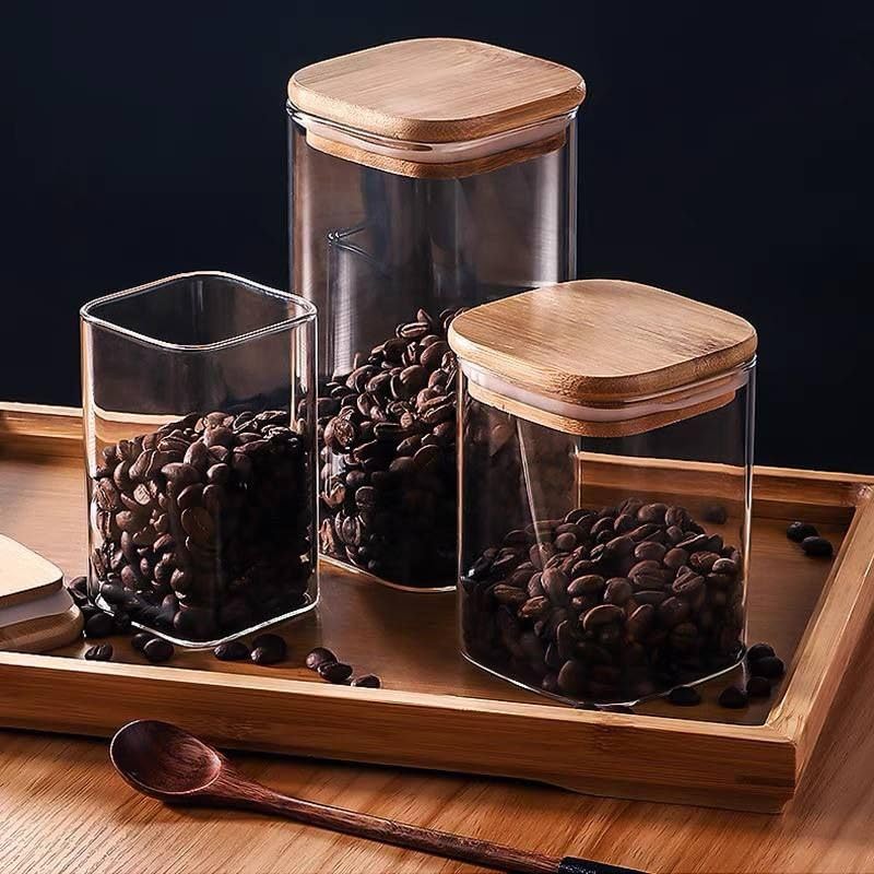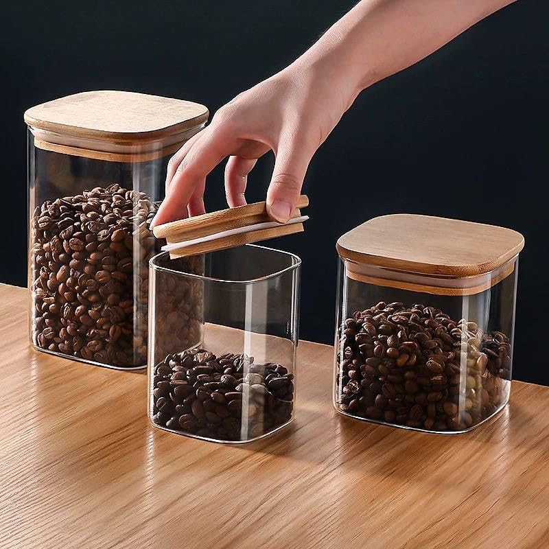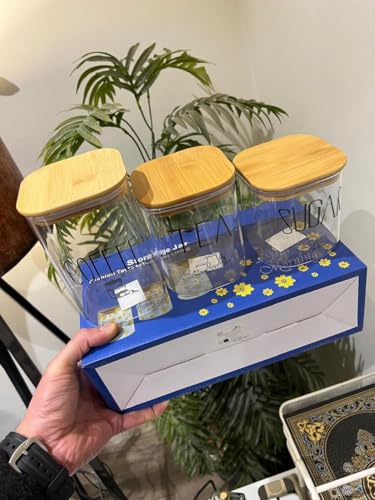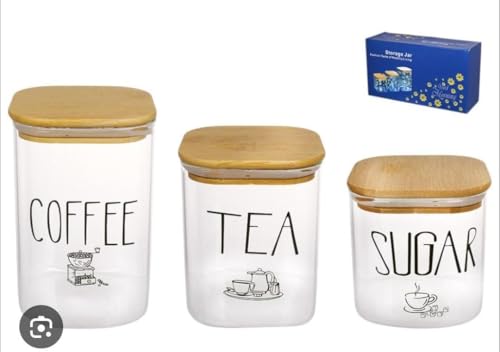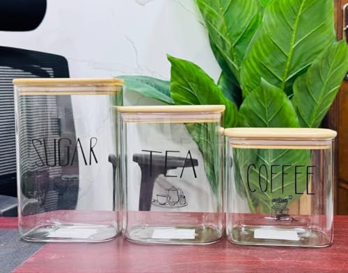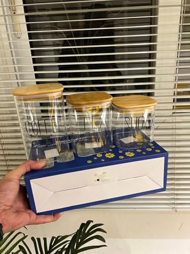 Generic - برطمانات تخزين الطعام الزجاجية المربعة - طقم 3 قطع مطبوع عليها SUGAR/TEA/COFFEE - اغطية خشب بامبو طبيعي محكمة الاغلاق - مثالية لتنظيم التوابل والبهارات والمكسرات - ديكور مطبخ انيق