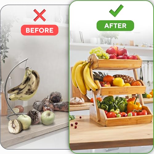 KOMFORA - سلة فاكهة من الخيزران مكونة 3 طبقات - حامل فاخر لسطح الطاولة - منظم واسع ومتين مع علاقتين - مثالي لتخزين الخبز والخضروات والوجبات الخفيفة ويحافظ على منتجاتك طازجة وجيدة التهوية