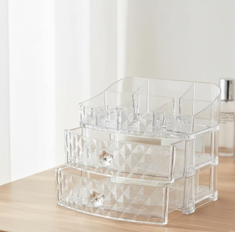 - تصميم بثلاثة أدوار مع درجين سفليين يتيح تنظيم أدوات التجميل والإكسسوارات بشكل واضح وسهل الوصول بدون فوضى.