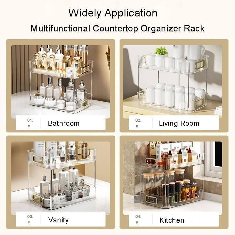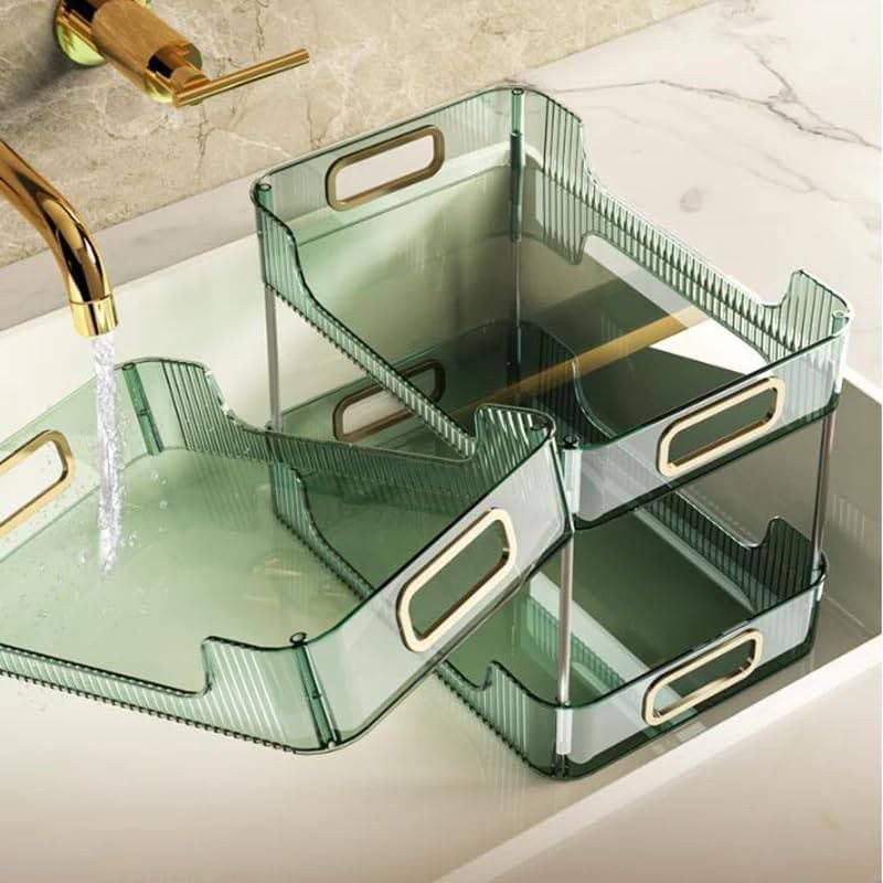 - يتميز بتصميم هندسي شفاف من 3 مستويات بارتفاع 46.5 سم يوفر سعة تنظيم منظمة واحترافية لجميع المقتنيات، مما يساعدكِ على ترتيب ركنكِ بذكاء تام.