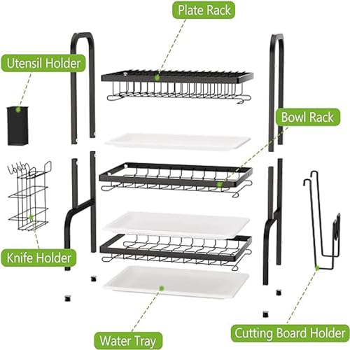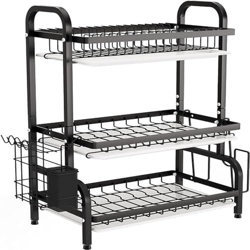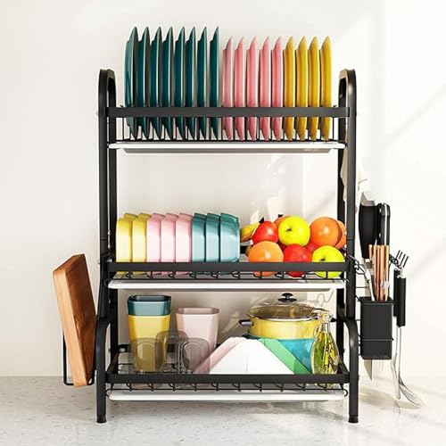Generic - رف لحمل الأطباق من ثلاث طبقات مزود بحامل للملاعق مصنوع من الفولاذ المقاوم للصدأ لتنظيم المطبخ، أسود