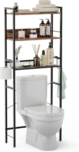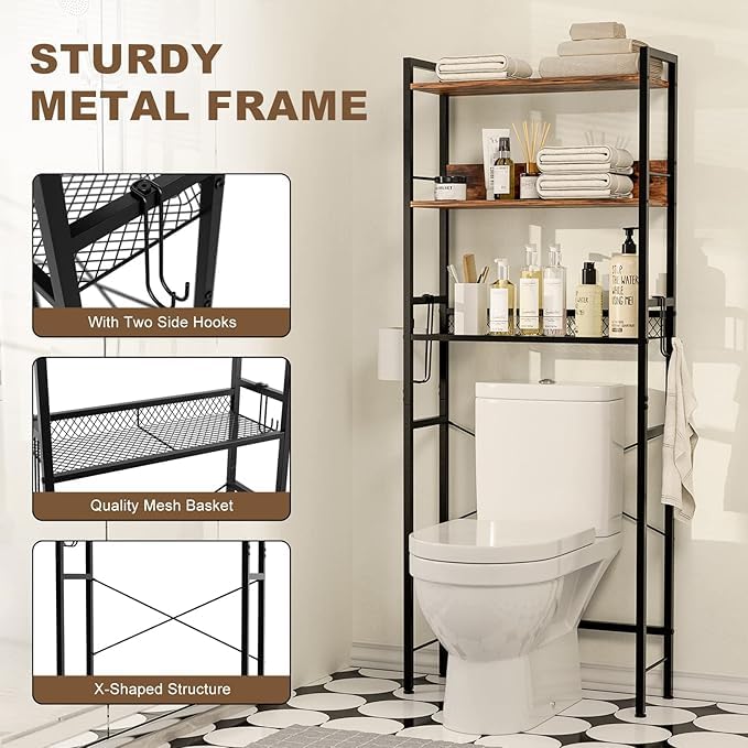 Generic - رف تخزين فوق المرحاض من 3 طبقات، موفر للمساحة للحمام مع رف شبكي، تصميم من الخشب الصناعي والمعدن