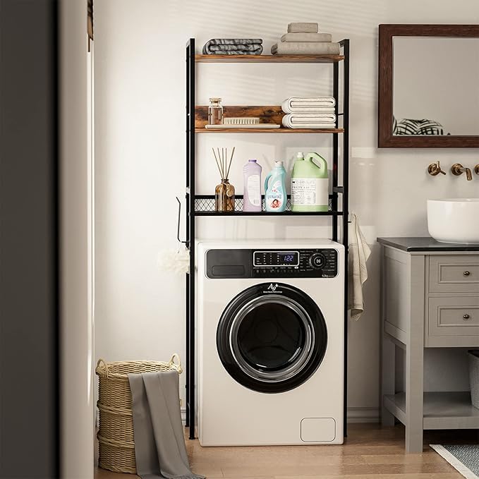- تصميم متعدد الاستخدامات: منظم حمام من 3 طبقات مع إطار معدني على الطراز الصناعي وأرفف خشبية، مثالي لزيادة المساحة فوق المراحيض القياسية