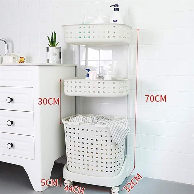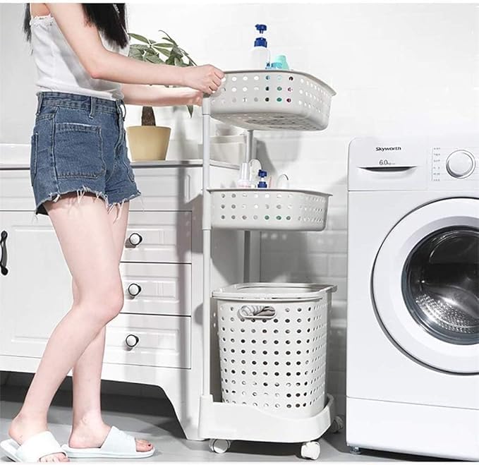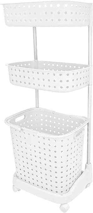 Generic - عربة تخزين دوارة بتصميم سلة غسيل من 3 طبقات، منظم بلاستيكي مع عجلات، لون ابيض