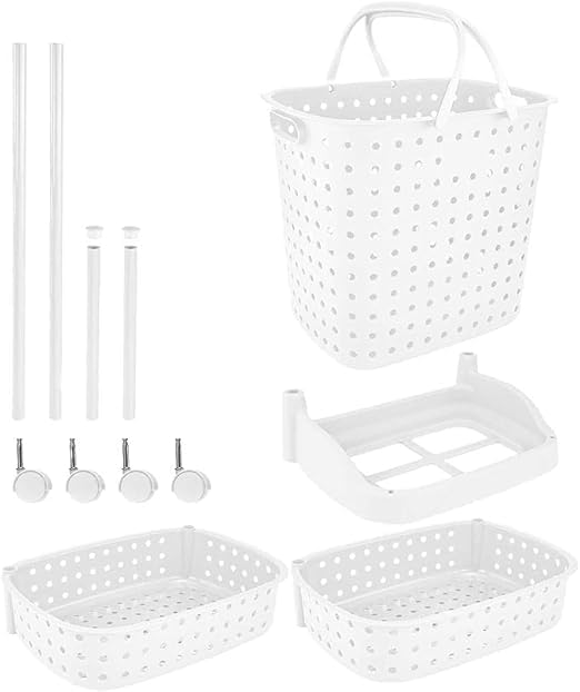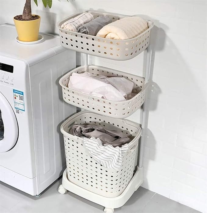 - تصميم متعدد الاستخدامات: عربة تخزين دوارة من ثلاث طبقات مع سلال بلاستيكية مثقبة، مثالية لتنظيم الغسيل واحتياجات التخزين المنزلي