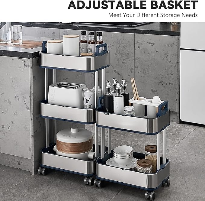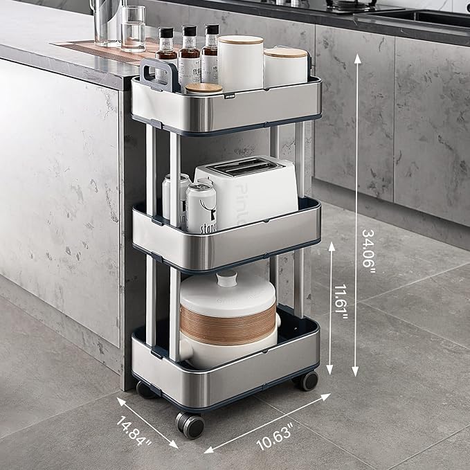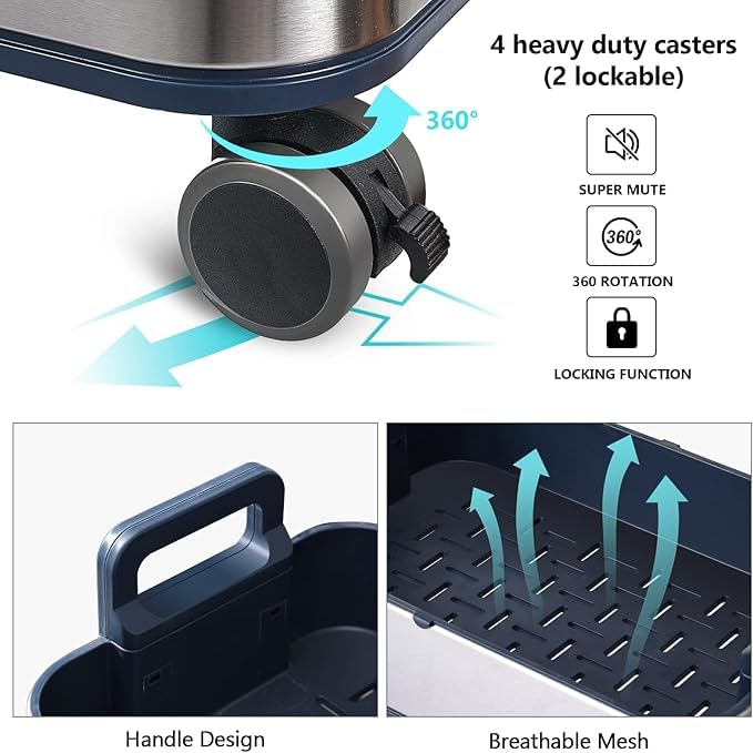 - تصميم متعدد الاستخدامات: عربة دوارة من ثلاث طبقات مصنوعة من الستانلس ستيل مع لمسات باللون الكحلي، مثالية للتخزين والتنظيم في أي غرفة في منزلك