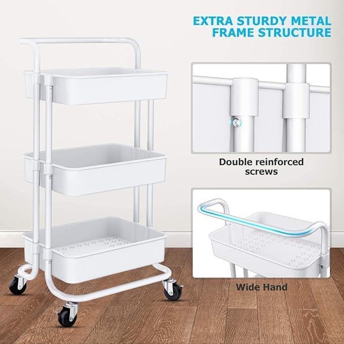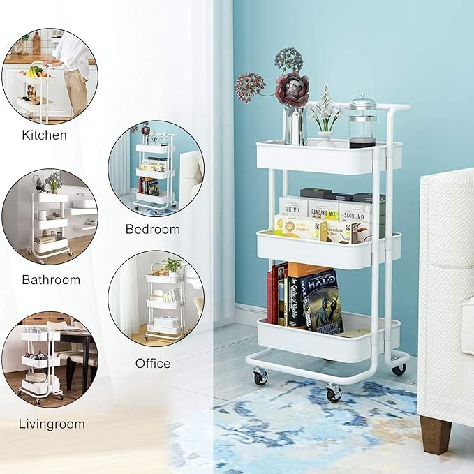Generic - عربة متعددة الاستخدامات دوارة من 3 طبقات، منظم تخزين متنقل مع مقبض، عجلات قابلة للقفل، ابيض
