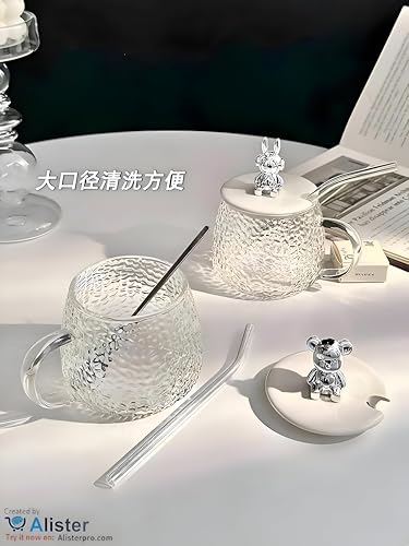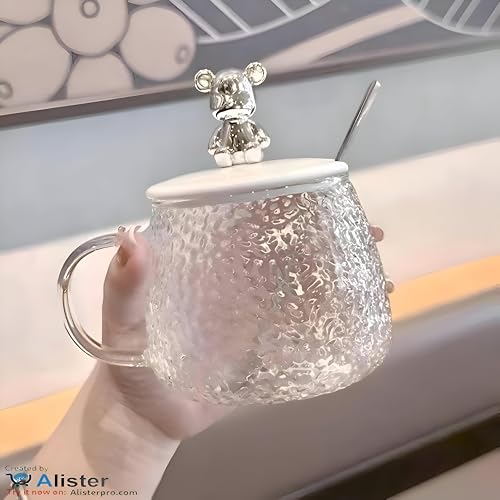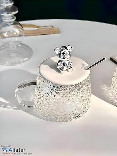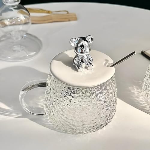 Generic - كوب زجاجي منقوش رائع بسعة 300 مل مع مقبض من الفولاذ المقاوم للصدأ وقمة بيضاء يحمل صورة دب تيدي فضي لطيف مثالي للاستمتاع بمشروباتك المفضلة مثل الحليب أو العصير الشوكولاتة القهوة المثلجة.