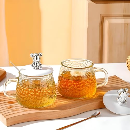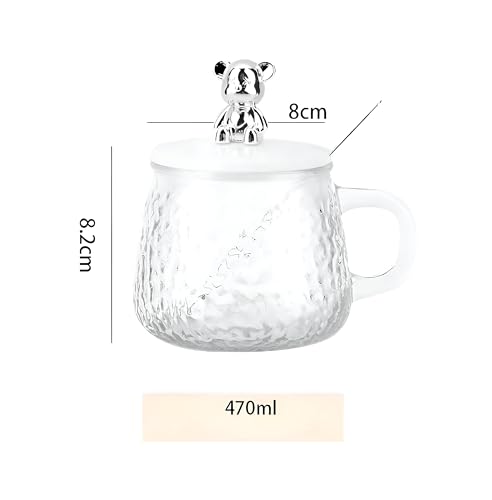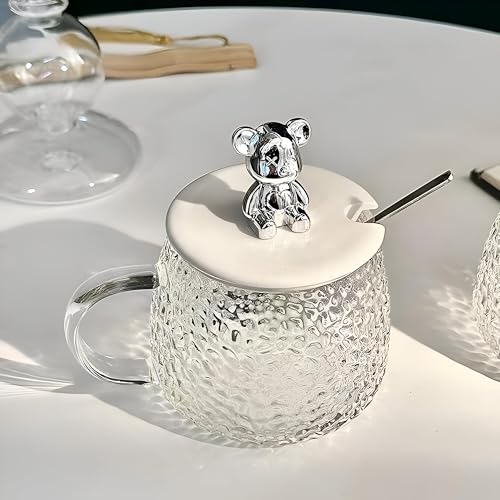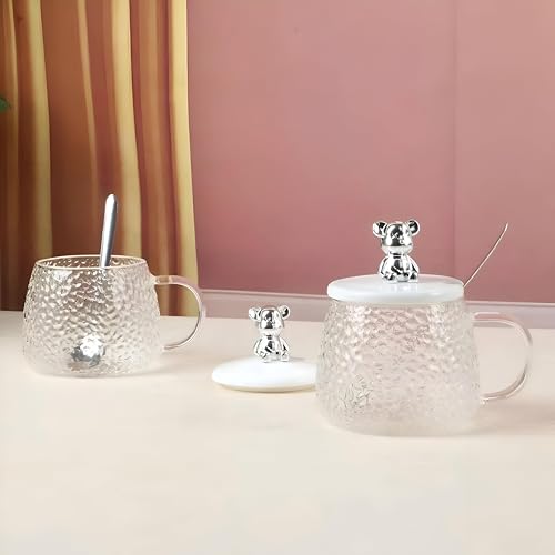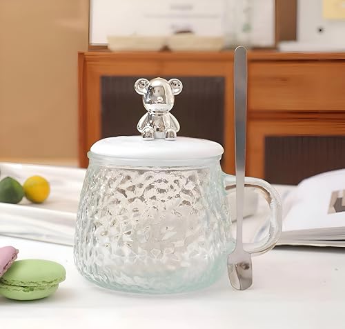 Generic - كوب زجاجي سعة 300 مل مع ملعقة من الفولاذ المقاوم للصدأ وغطاء لطيف على شكل دب مثالي لتقديم مشروباتك المفضلة مثل الحليب أو العصير الشوكولاتة القهوة المثلجة المورد الافضل للمنتج 🏡 البيت الانيق