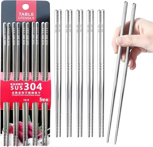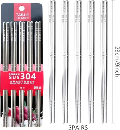Generic - طقم عيدان طعام ستانلس ستيل 304 – 5 أزواج بطول 23 سم، قابلة لإعادة الاستخدام وآمنة لغسالة الصحون