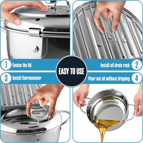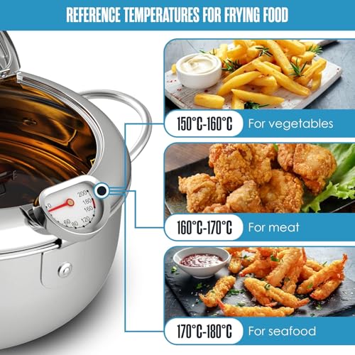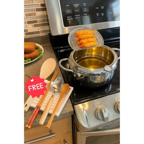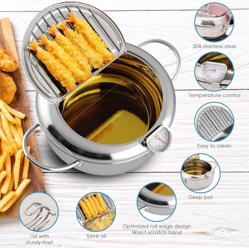 Generic - مقلاة عميقة ستانلس ستيل 304 مقاومة للصدأ مع غطاء ورف تصفية وميزان حرارة – قدر تمبورا ياباني للقلي العميق 2.2 لتر للبطاطس والدجاج – مسند أدوات مطبخ هدية مجانية